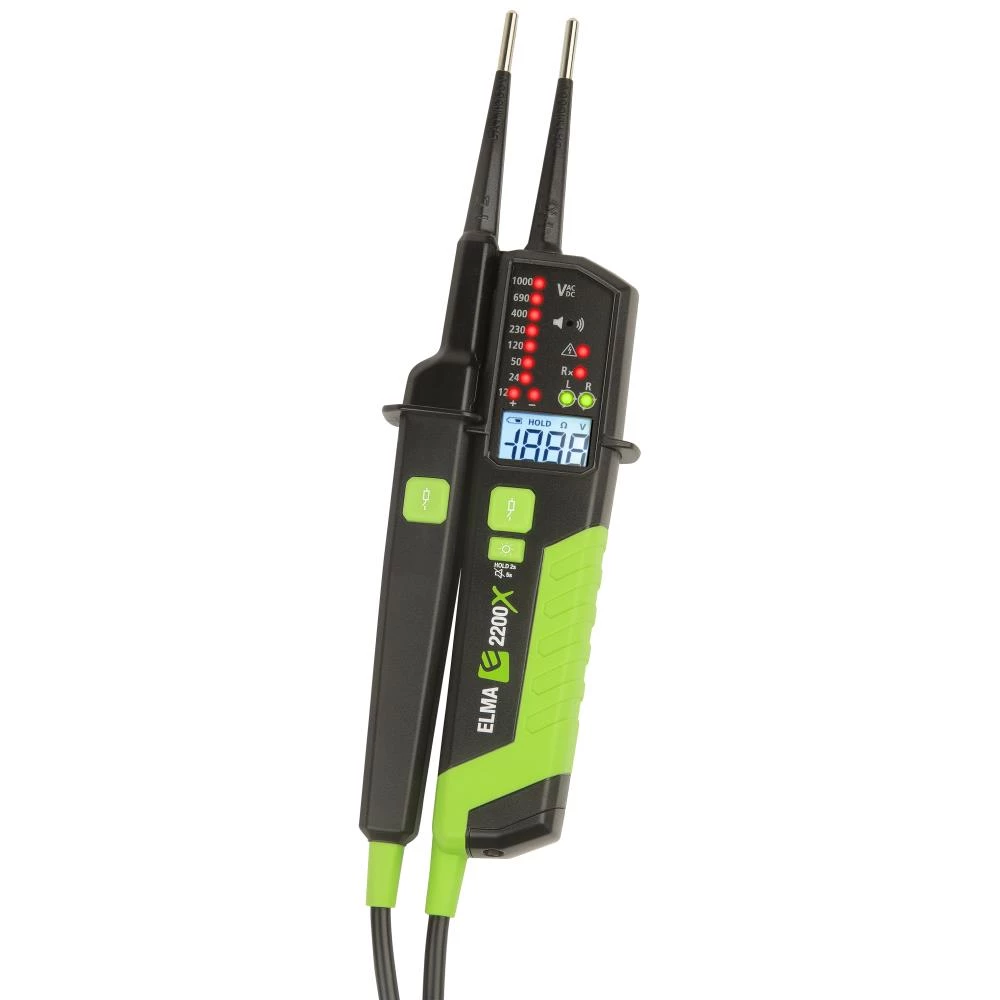 Elma 2200X spændingstester med prøveledninger i ekstra kraftig kvalitet. Højeste sikkerhedskategori IV: kan belaste målepunkt og har ekstra stort måleområde for DC til hele 1.500 V gør testeren velegnet til at måle på drivspændingen på elbiler og hybridbiler samt PV solceller. Velegnet til de fleste elektrikeropgaver, L-AUS arbejde og konstatering af spændingsløs tilstand, hvor det er lovpligtigt at anvende et instrument, som overholder spændingstesterdirektivet. Perfekt til måling på ladestik og ladestandere EVSE til elbiler. Spændingstest, 2 polet med lysdioder 12-1.000 V AC/DC. Spændingsmåling med digital visning 6-1.000 V/1.500V AC/DC. Gennemgangstest. Modstandsmåling 0-1.999 ?. Polsøger, et-polet spændingstest som indikerer fasen. Fasefølge-/drejefelt test, 2 polet for 3 faset net. Stor tydelig belyst display og højeffektive lysdioder. Selvtest- og auto on/off funktion. Advarsel med diode ved farlig spænding uden batteri for L-AUS arbejde. Opfylder spændingstesterdirektivet for kontrol af spændingsløs tilstand. Meget kraftige fastmonterede ledninger. Udskiftelige prøvespidser 2/4 mm. Indbygget kraftig lommelygte. Opfylder IEC 61010-1 KAT IV 600 V / IEC 61243-3:2014. Leveres komplet med batterier og vejledning.