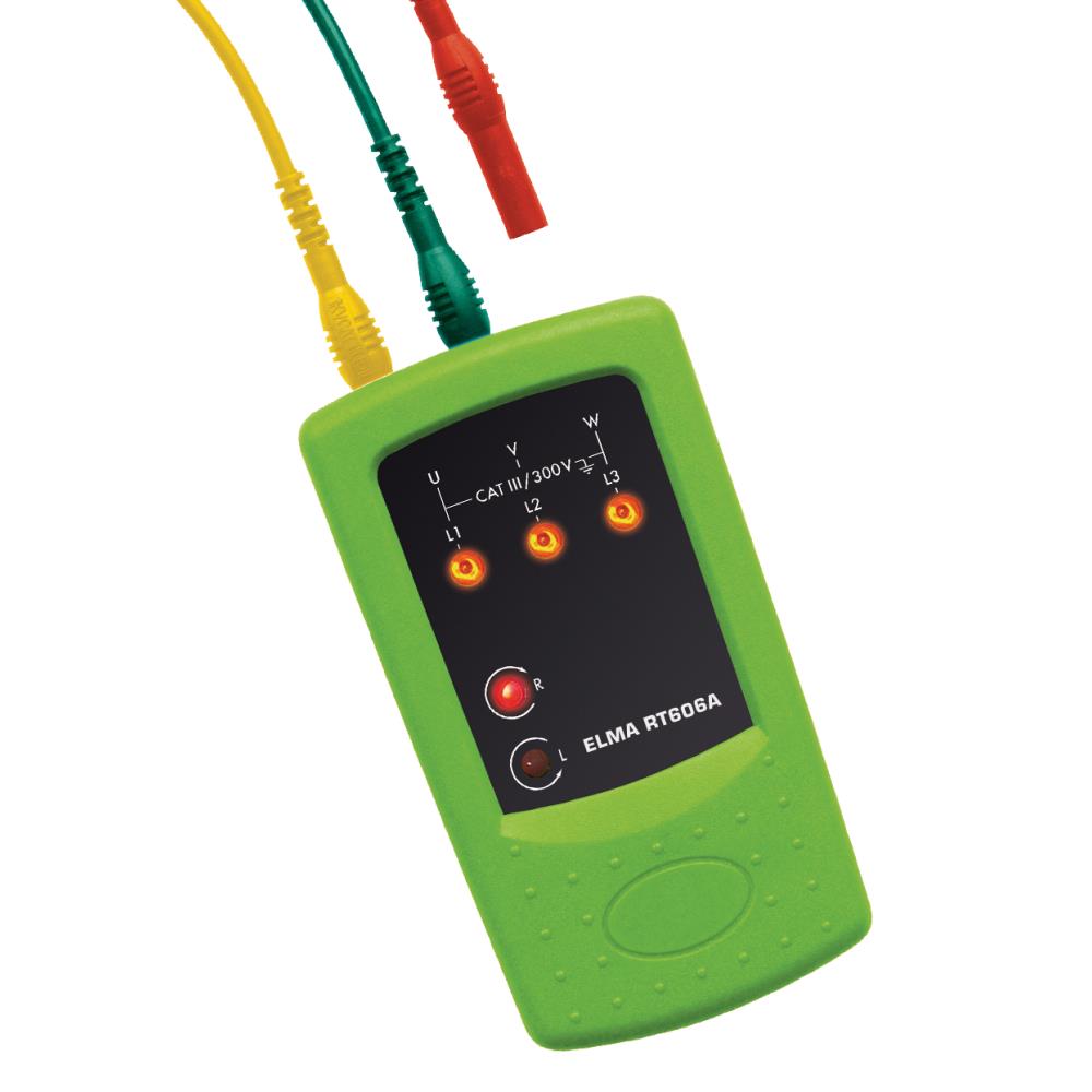 Elma RT606A er en handy elektronisk fasefølgetester, som med kraftige lysdioder viser drejefelt og indikerer de enkelte faser. Instrumentet opfylder IEC 61010-1 KAT III 300V og leveres med sikkerhedsprøveledninger, 3 isolerede krokodillenæb og 3 prøvepinde.