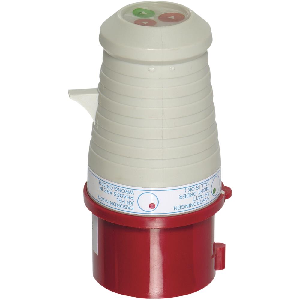 Standard 16A CEE stikprop med indbygget fasefølge-/ drejefeltstester med lysdiode indikering af rigtig/forkert montering og manglende fase/nul/jord. CEE fasefølgetesteren er det ideelle kontrolinstrument for alle, som benytter CEE stik og som vil være sikre på, at have rigtig montering og korrekt fasefølge/drejefelt.