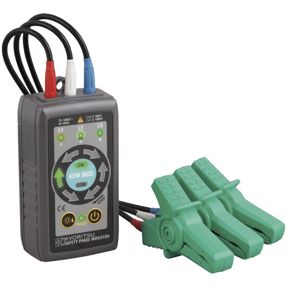 Kyoritsu 8035 er en unik ny fasefølgetester, som uden elektrisk kontakt viser fasefølge/drejefelt. De tre næb sættes uden på isoleringen på tre separate faser. Når det er tre rigtige og forskellige faser viser instrumentet med de store og meget kraftige røde og grønne lysdioder fasefølge/drejefelt. Instrumentet opfylder KAT IV 600V og er derfor i kombination med de ekstra kraftige kulørte LED lysdioder meget velegnet til udendørs brug. Kyoritsu 8035 opfylder IEC 61010-1 KAT IV 600V / III 1000V og leveres komplet i taske inkl. batterier og betjeningsvejledning.