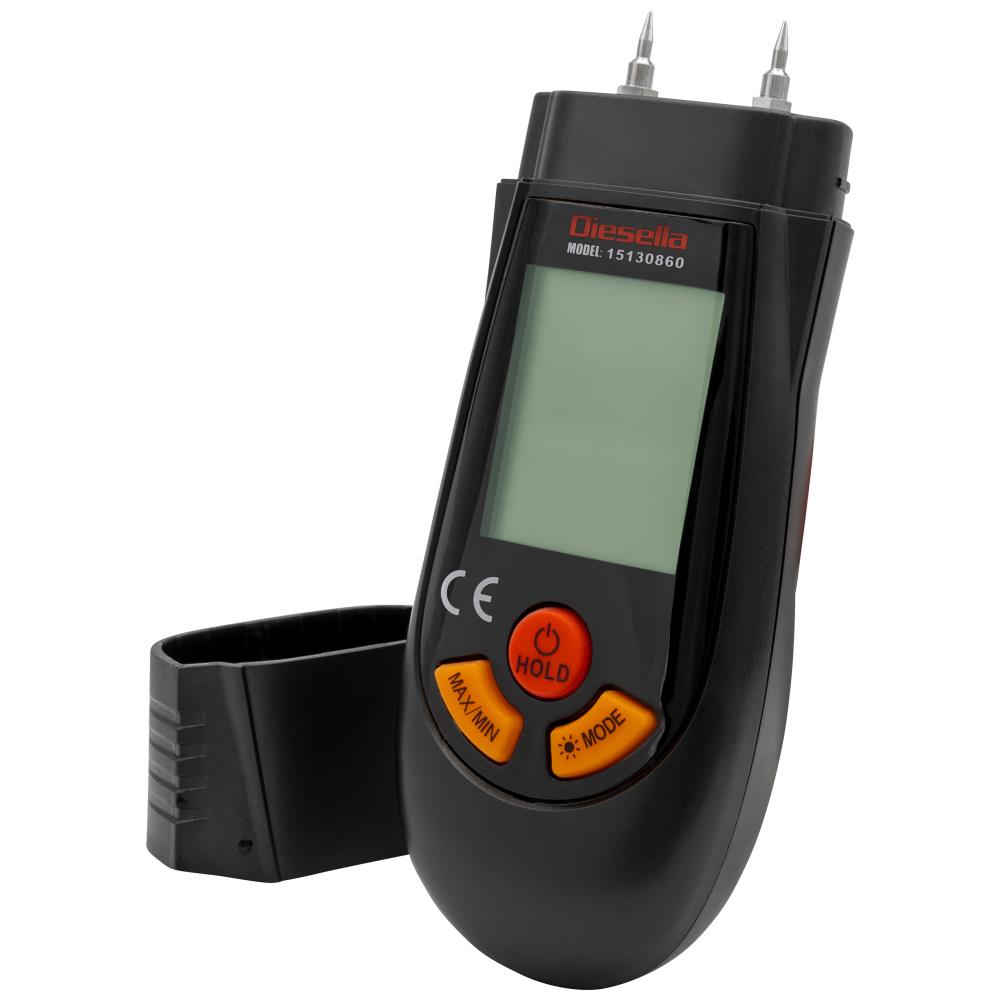 Brugervenlig håndholdt fugtmåler til måling af fugtindhold i tømmer/træ ved at trykke to målespidser ind i materialet. Måleresultatet vises straks på LCD-displayet. Enheden har 3 materialegrupper som er nemme at vælge, afhængigt af hvilken træsorter man skal måle i. Displayet har baggrundsbelysning der slukker automatisk efter 15 sekunder. Velegnet til tømrere, ejendomsinspektører og boligejere. Lys (Hold “mode” nede). Automatisk tænd/sluk-funktion. Nøjagtighed ± 2 %. Batteri 2× AAA medfølger.