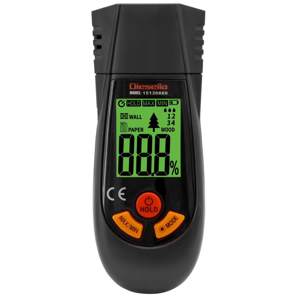 Brugervenlig håndholdt fugtmåler til måling af fugtindhold i tømmer/træ ved at trykke to målespidser ind i materialet. Måleresultatet vises straks på LCD-displayet. Enheden har 3 materialegrupper som er nemme at vælge, afhængigt af hvilken træsorter man skal måle i. Displayet har baggrundsbelysning der slukker automatisk efter 15 sekunder. Velegnet til tømrere, ejendomsinspektører og boligejere. Lys (Hold “mode” nede). Automatisk tænd/sluk-funktion. Nøjagtighed ± 2 %. Batteri 2× AAA medfølger.