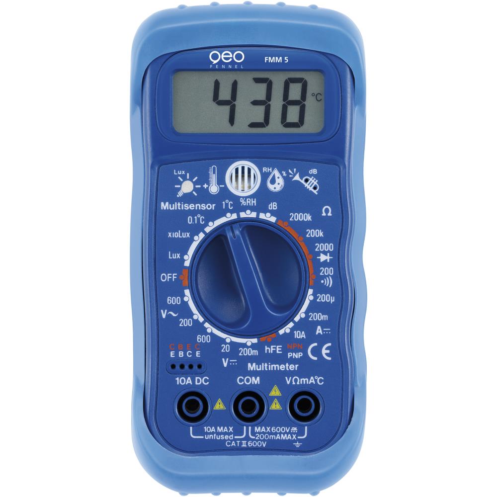 5-i-1 digitalt multimeter til støjmålinger, lysmålinger, fugtighedsmålinger og temperaturmålinger samt universalmålinger til DC, AC spænding, DC modstand, transistor hFE, dioder og kontinuitetstest. Beskyttet mod overbelastning. Leveres med batterier, målesonde/kabel TP-500 (85 cm lang), prøvekabel og æske.