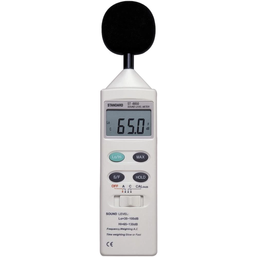 Støjmåler til hurtige målinger af støjniveau på f.eks. fabrikker, skoler, lufthavne og kontorer eller til måling af akustik i f.eks. studier og auditorier. Maks.- og hold-funktion samt strømudtag til tilslutning til analysator eller optager. Indbygget kalibrering. Indikation ved for stort område. Nøjagtighed ved 94 dB, 1,5 dB. Leveres inkl. æske og 9V batteri.