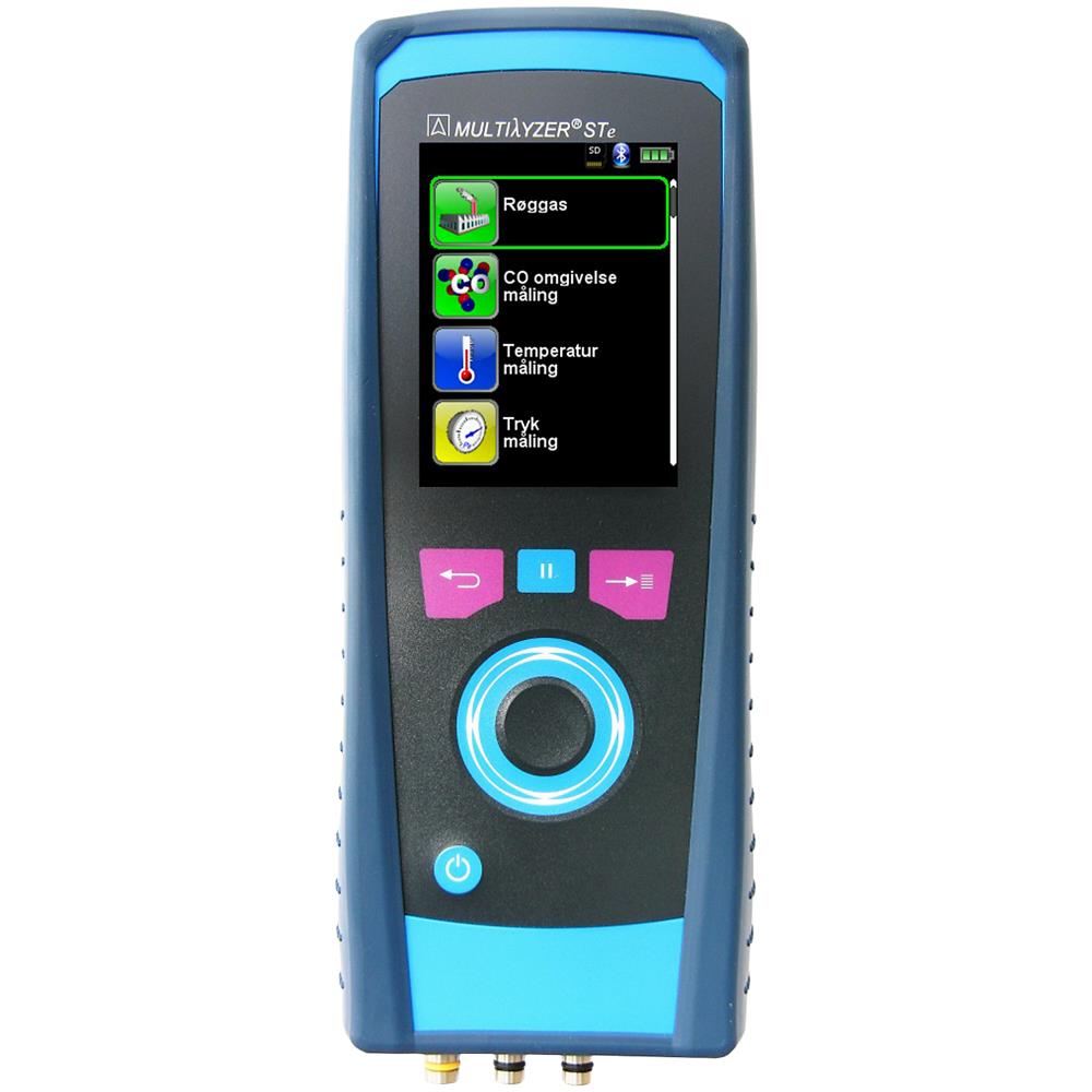 Systronik Multilyzer røggasanalysatorer er designet til at dække ethvert behov i forbindelse røggasmåling på kedelanlæg af alle størrelser, og uanset brændselstypen, -også på bivalente og modulerende kedelanlæg. Fleksibilitet er et af nøgleordene for den nye Multilyzer STe, som kan bestykkes med op til 6 måleceller, således at der kan måles O2, COH2, COhigh, NO, NO2 og SO2. På baggrund af ovenstående målte værdiger beregnes CO2, Dugpunkt(Tdew), deltaT, deltaP, COabsolut, Røggastab(qA), Lambda og Virkningsgrad. Multilyzer STe kan med CO-High cellen(option) måle midlertidige peak-værdier af CO, på helt op til 20.000 ppm. Multilyzer STe er dermed det ideel instrument til service og indreguleringsopgaver på fastbrændselsfyrede kedelanlæg. Alle Multilyzer STe’er har indbygget differenstryksanemometer, til måling af skorstenstræk, ligesom det kan anvendes, med det medfølgende program til bestemmelse af tryktab. Til Multilyzer STe kan der via app tilkøbes et Pitot-program, hvorved Multilyzer STe også kan anvendes som differenstryks-anemometer til bestemmelse af lufthastighed og flow. Som indbygget sikkerhedsfunktion har Multilyzer STe, et program til måling af CO koncentrationenen i omgivelsesluften, hvilket sikre brugeren mod kulilteforgiftning, ved utilsigtede udslip i f.eks. fyrrum. Det 3,5″ store TFT-farvedisplay kan vise op til 8 måleværdier, samtidig. Displayet er farvegradueret, hvilket medføre at displayets måleværdier vises med rødt, hvis indstillede grænser overskrides. Derudover betyder det at displayets layout skifter farve, afhængig af målefunktionen. Eks: grøn=røggas, gul=tryk, blå=temperatur osv. Det er medvirkende til at minimere sandsynligheden for fejlbetjening, særligt hvis Multilyzer STe fjernbetjenes, hvilket er muligt i en afstand op til 12 meter, via den indbyggede Bluetooth-Smart. Alle målinger foretaget med Multilyzer STe, kan gemmes i Systroniks smarte “Database-Memory”, som er standard i Multilyzer STe, med plads til op til 1000 kunder (10.000 målinger), eller data kan gemmes på det optionelle SD-kort (SDHC), som findes med en hukommelse på helt op til 16 GB. Dataloggerfunktion er ligeledes en option Multilyzer STe, der tilkøbes via app. Gemte data kan let overføres til PC, tablet, notebook mv. med kabel, via den indbyggede USB-port (2.0), eller trådløst via den sidst nye Bluetooth-version (Bluetooth-Smart/4.0). Sidste men ikke mindst kan Multilyzer STe generere QR-codes (Quick release), som kan scannes med smartphone eller tablet, for let og hurtig overførsel af data. Endelig kan gemte målinger og data, trådløst, udskrives via EuroPrinter (medfølger ikke). Lithium-Ion batteri muliggør op til 15 timers kontinuerlig drift på bare én enkelt opladning, når Multilyzer STe anvendes i ECO-mode. Multilyzer STe opfylder den Europæiske Norm for “Transportabelt måleudstyr inden for røggasmåling”: EN 50379. O2, COH2, COhigh, NO, temperatur og tryk i henhold til EN 50379-1 og 2. Multilyzer STe leveres komplet inkl. 300 mm sonde med 2,4 mtr slange, konus, røggasfilter med kondensatudskiller, temperaturføler, beskyttelseskappe med magneter, oplader, TÜV-godkendelse, kalibreringscertifikat samt betjeningsvejledning.