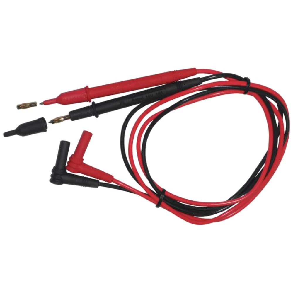 Prøveledningssæt bestående af 1 rød og 1 sort silikoneledning, 1 mm², 100 cm, forsynet med 4 mm vinkelbananstik med beskyttelseskappe og prøvepind med mulighed for at skifte mellem 2 mm og 4 mm målespids. Opfylder IEC 61010 KAT IV 1000V og KAT II 1000V.