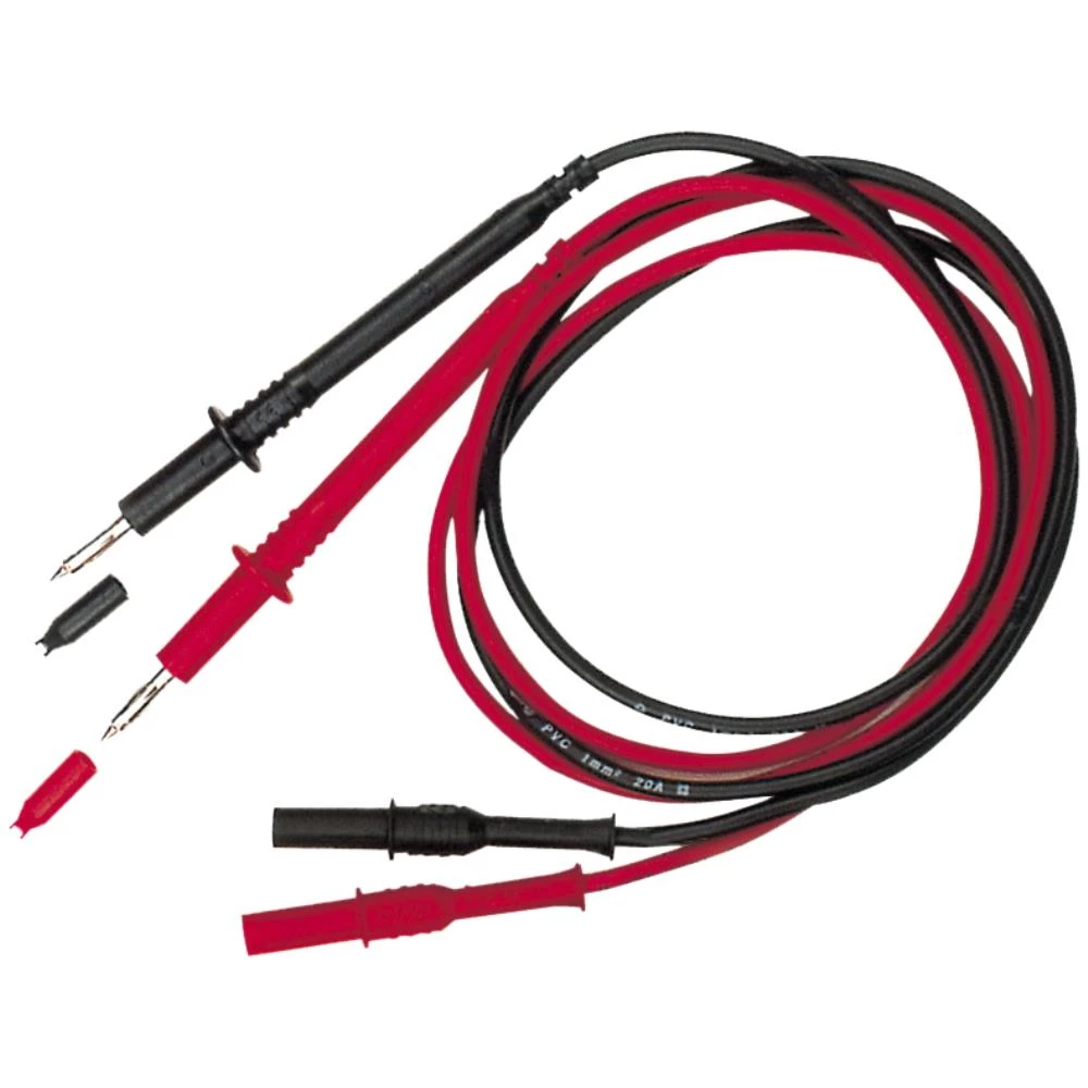 Rød/sort 1000V/20A. Sæt bestående af 1 rød og 1 sort PVC-ledning, 1 mm2, 100 cm, forsynet med 4 mm bananstik med beskyttelseskappe og prøvepind med mulighed for montering af næb o.lign.