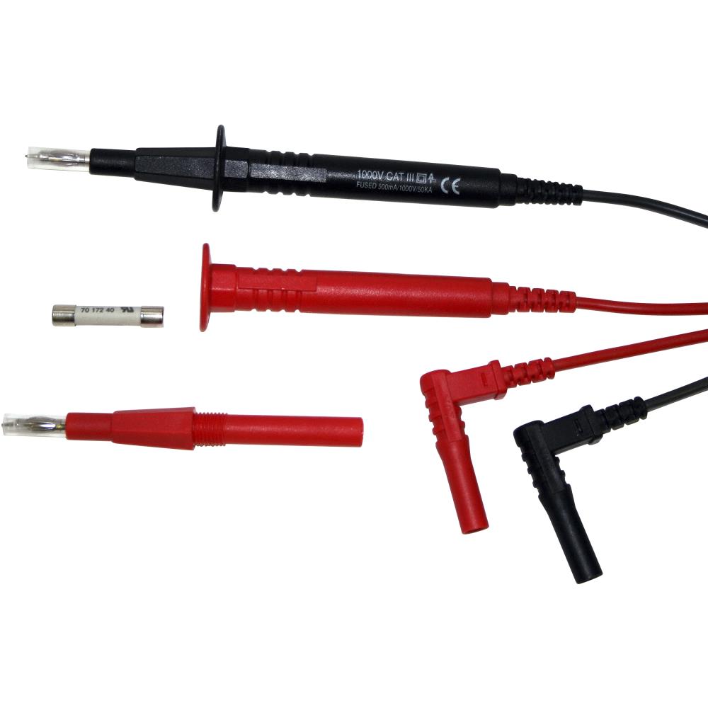 Sikkerhedsprøveledningssæt Elma 13124 for ekstra stor personsikkerhed. Ekstra kraftige prøveledninger med indbygget sikring i begge håndtag, 500mA/1000V/50kA brydeevne. Ledningerne er dobbeltisolerede 1 mm2, 1,2 m længde, monteret med højisoleret håndtag og vinkelbananstik. Prøveledningerne opfylder IEC 61010-1 KAT III 1000V og leveres som sæt, rød/sort. Prøveledningssættet kan også leveres med ekstra sikringer 10A eller 16A til f.eks. kortslutningsmåling.