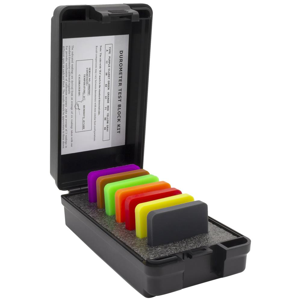 Shore A testblokke i sæt med 7 stk. testblokke til sammenligning og kontrol af hårdheden for bløde, ikke metalliske materialer. Indhold: lilla 32, brun 39, grøn 52, orange 61, rød 71, gul 80 og grå 88. Siden markeret med “HA” er den standard detekterende side. De angivne målinger er afledt af et gennemsnit på 6 målinger taget med standard durometer, som er kalibreret regelmæssigt.