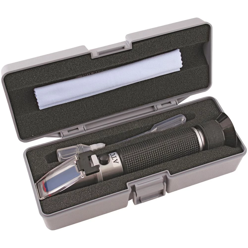 Brix refraktometer til kontrol af blandingsforholdet i kølesmøremidler. For lidt koncentrat betyder utilstrækkelig smøring hvorved risikoen for korrosion øges betragtelig. For meget koncentrat giver derimod dårligere performance pga. reduktion af varmeafledningen. Refraktometeret har indbygget automatisk temperaturkorrektion og skjult kalibreringsskrue, som sikrer at refraktometeret ikke fejljusteres under brug. Dobbeltled på lyspladen (slutter helt tæt til prismen). Apparatet har stor lysfølsomhed. Måleområde 0-18 % (ATC) – min. 0,1 %. Nøjagtighed + 0,1 %. Leveres i plastæske med brugsanvisning, kalibreringsværktøj, klud og pipette.
