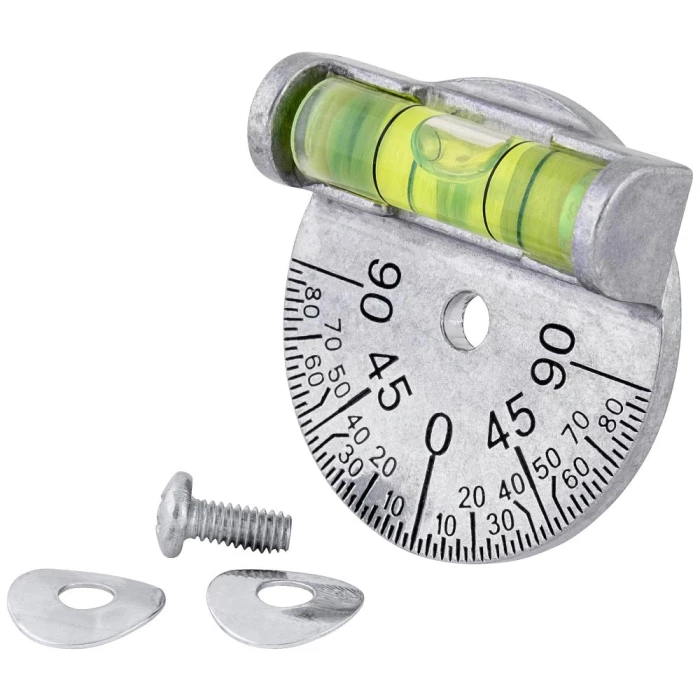 Vinkelmålerskive med bobble-vinkelmåler, som kan bruges sammen med andre Curv-O-Mark produkter. Vinkelmåleren dækker 180° gennem to 90° kvadranter, aflæsning i 2-1/2° interval. Vinkelmåleren er støbt aluminium.