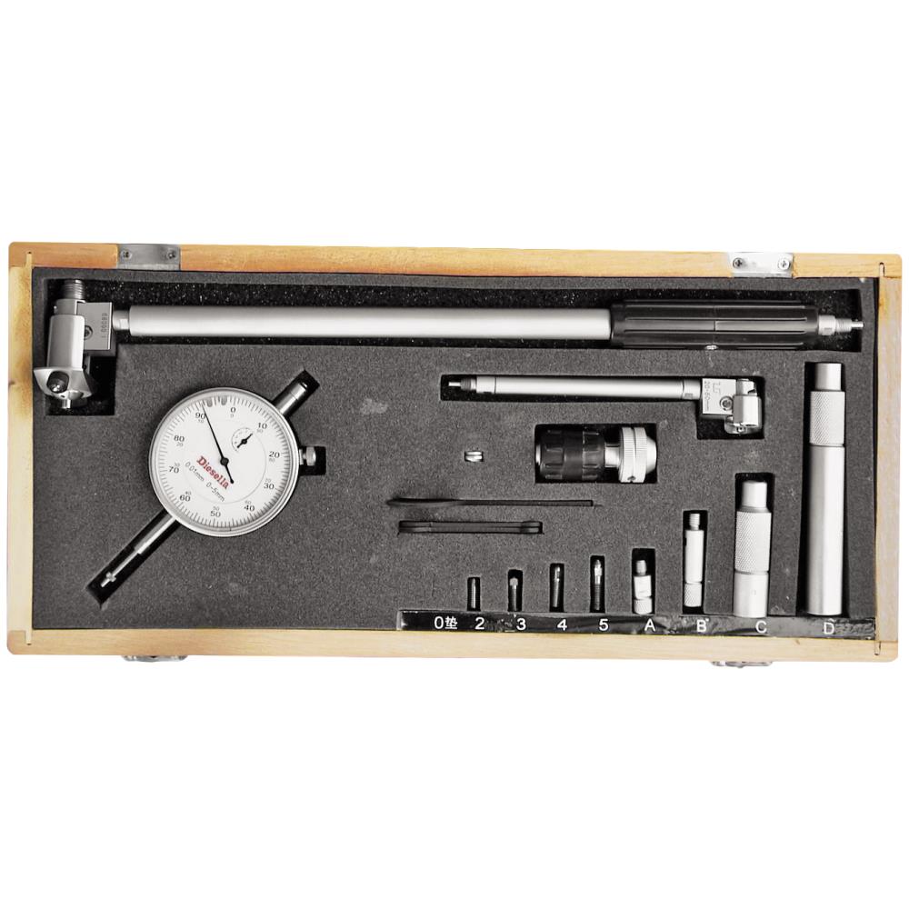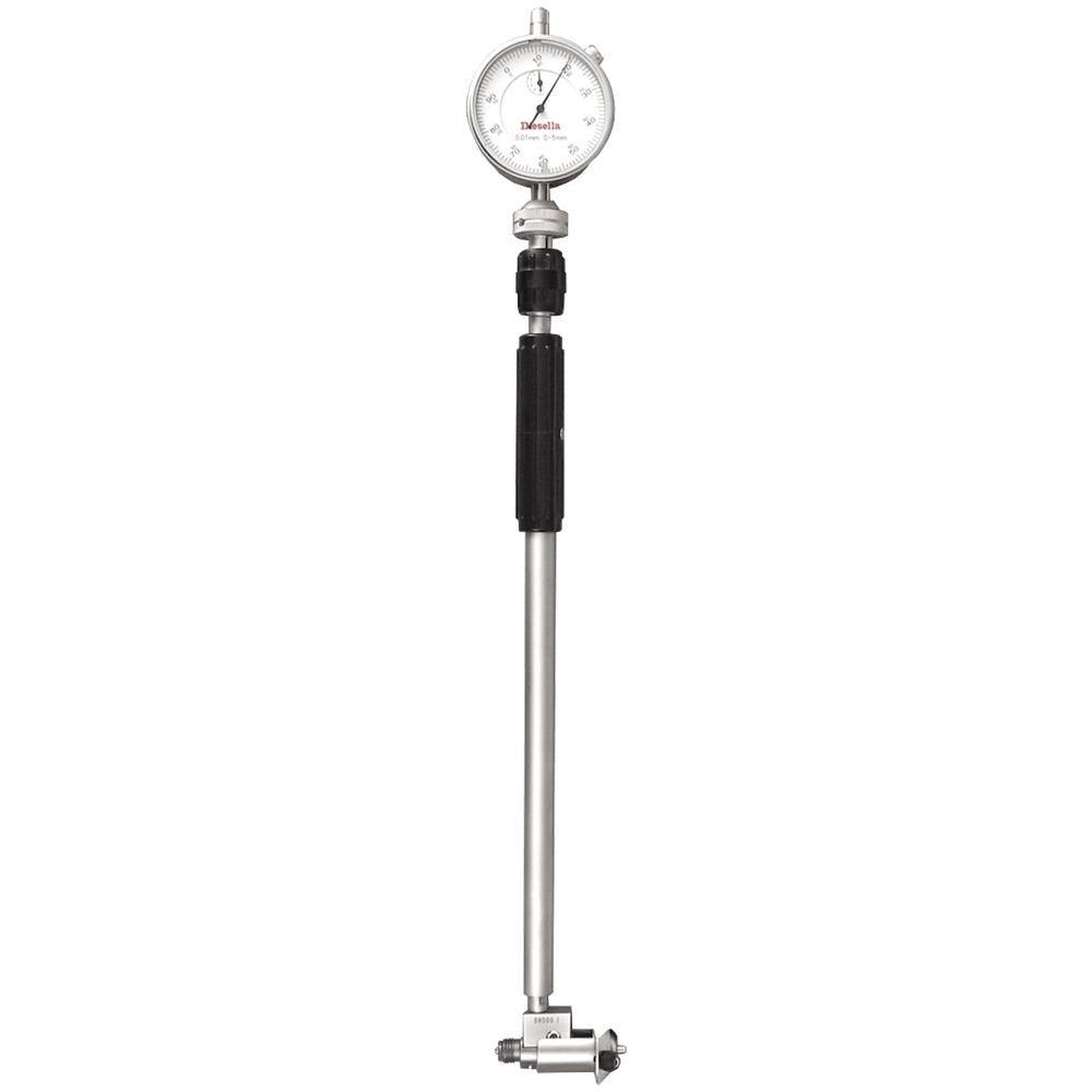 Cylindermåler til måling af indvendig diameter af et hul, en cylinder eller et rør. Sammen med brugen af en mikrometerskrue kan en cylindermåleren give den nøjagtige aflæsning af en cylinders størrelse. En typisk cylindermåler består af et skaft, hvor der øverst monteres et måleur, og nederst selve måleslæden som anvendes ned i hullet/ind i cylinderen. Måleslæden består af tre guider og et bevægeligt målehovedsstempel. Måleuret giver dig hurtige og præcise aflæsninger på størrelsen og hvorvidt hullet/cylinderen er “mindre end perfekt rundt” eller slidt. Måleområde 20-200 mm med 0,01 mm aflæsning og måledybde 105/290 mm.