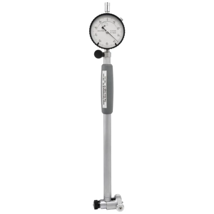 Fin-cylindermåler til kontrol af boringer for ø-nøjagtighed, cylindrisk form og rundhed. Måleområde 50-160 mm, måledybde 150 mm. Inkl. 12 stk. udskiftbare målespidser (ø6 mm), 55 mm forlænger og tilpasningsskiver 0,5/1,0/2,0/3,0 mm.
