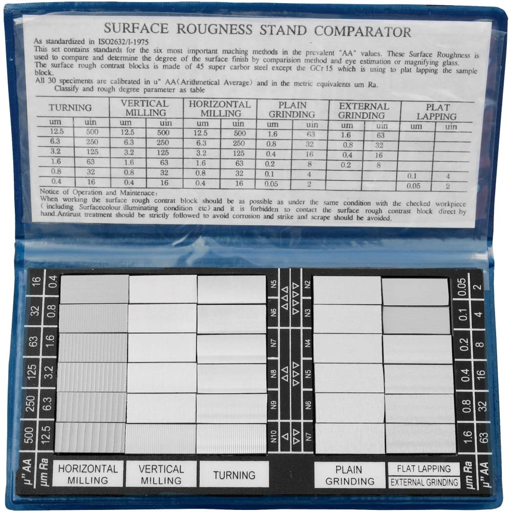 Overfladenormal til syns- og følesammenligning. Sættet indeholder 30 sammenligningsmønstre. Ra 0,05-12,5 µm, format ca. 120×90 mm. Dreje, endefræse, sidefræse, planslibe, akselslibe og lapning. ISO 2632/I-1975 standard.