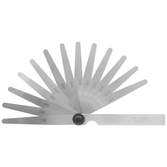 Søgerblade i sæt. Fjederkonstante stålblade i konisk form med påskrift af tykkelse. Forniklet holder med nittet led som kan spændes. DIN 2275. Nøjagtighed efter klasse T2. 13 blade i tykkelserne 0,05-1,00 mm: 0,05 – 0,10 – 0,15 – 0,20 – 0,25 – 0,30 – 0,40 – 0,50 – 0,60 – 0,70 – 0,80 – 0,90 – 1,00 mm.