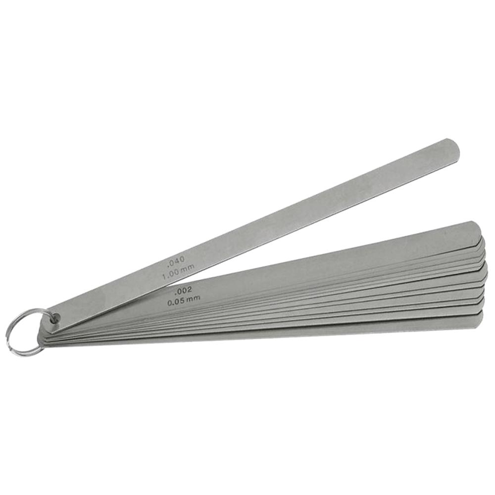 Søgerbladesæt med fjederkonstante stålblade med cylindrisk afrunding og påskrift af tykkelse. Forniklet holder med nittet led som kan spændes. Nøjagtighed efter klasse T2. Indeholder: 13 blade i tykkelserne 0,05-1,00 mm: 0,05 – 0,10 – 0,15 – 0,20 – 0,25 – 0,30 – 0,40 – 0,50 – 0,60 – 0,70 – 0,80 – 0,90 – 1,00 mm.