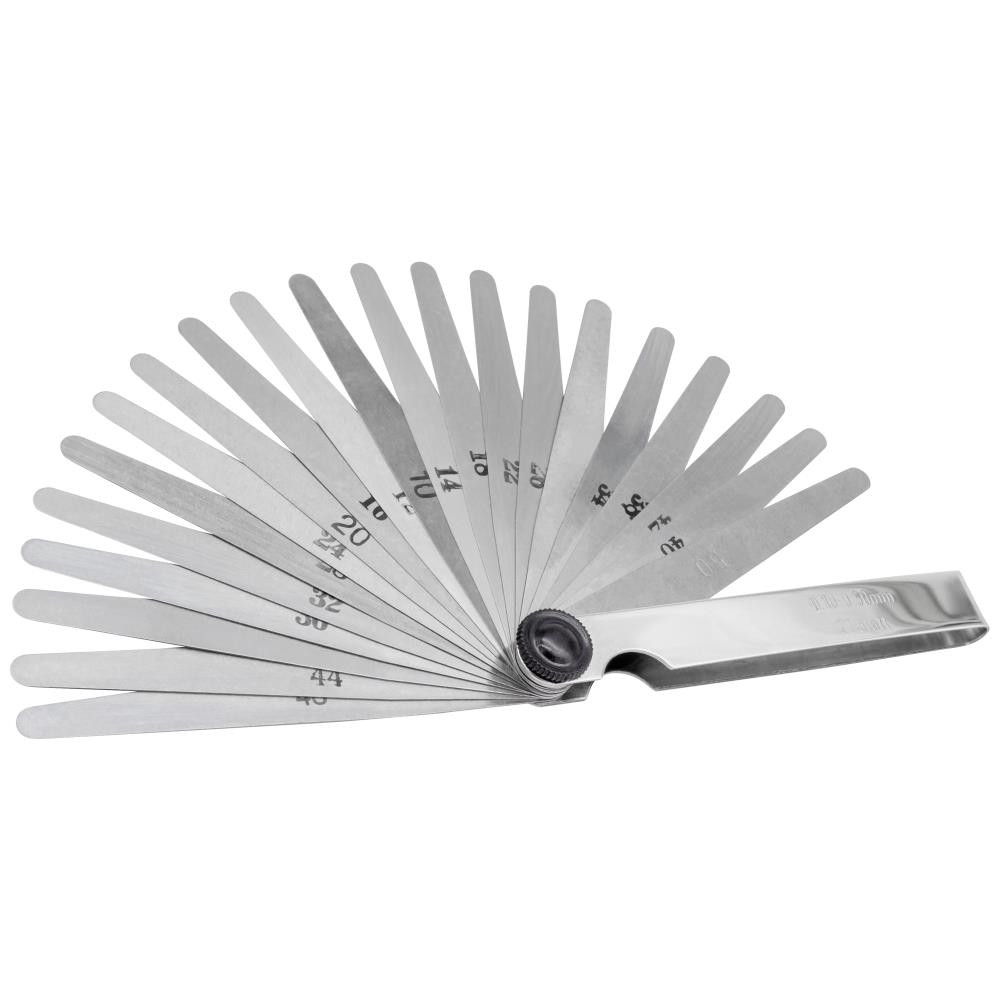 Søgerblade i sæt. Fjederkonstante stålblade i konisk form med påskrift af tykkelse. Forniklet holder med nittet led som kan spændes. DIN 2275. Nøjagtighed efter klasse T2. 21 blade i tykkelserne 0,10-0,50 mm: 0,10 – 0,12 – 0,14 – 0,16 – 0,18 – 0,20 – 0,22 – 0,24 – 0,26 – 0,28 – 0,30 – 0,32 – 0,34 – 0,36 – 038 – 0,40 – 0,42 – 0,44 – 0,46 – 0,48 – 0,50 mm.