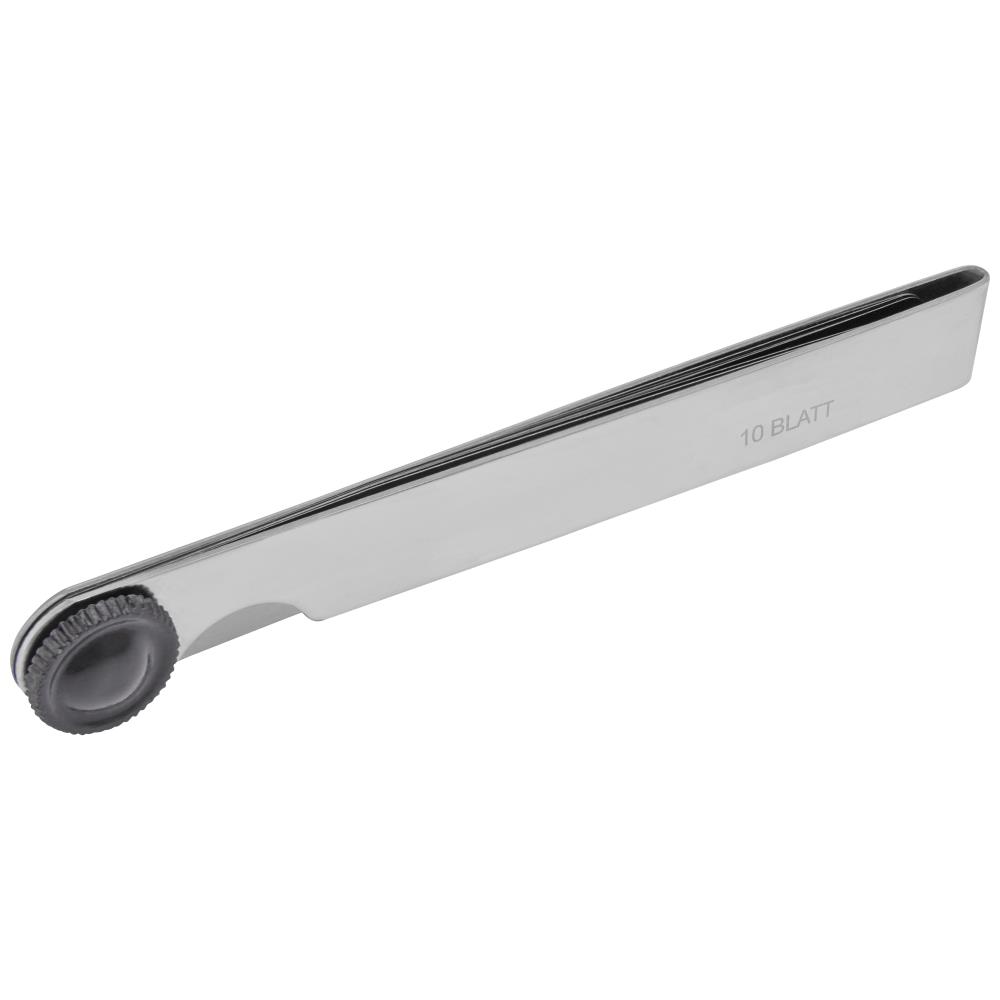 Fjederkonstante stålsøgeblade i konisk form med påskrevet tykkelse. Forniklet holder med nittet led som kan spændes. Nøjagtighed efter klasse T2. DIN 2275. Sæt med 10 blade i tykkelserne: 0,10 – 0,20 – 0,30 – 0,40 – 0,50 – 0,60 – 0,70 – 0,80 – 0,90 – 1,00 ×100 mm.