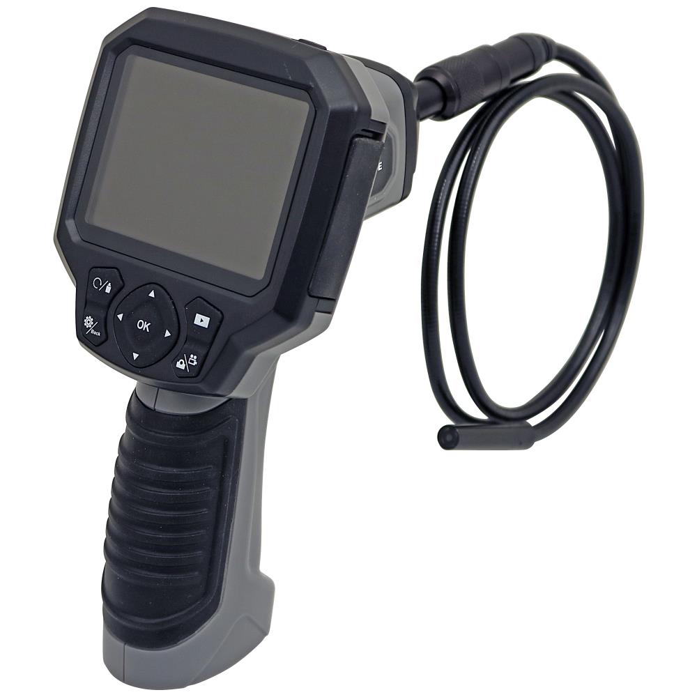 Kompakt video-inspektionskamera med 1 mtr. kabel med ø9 mm IP67 vandtæt kamerahoved til visuel kontrol, bla. til inspektion af bygningshulrum, rør, og andre vanskelige steder. LCD skærmstørrelse 3,5″ 320×240 pixel opløsning. Fokusering, LED-belysning, automatisk frakobling, Digital Zoom og REC-funktion til senere analyse af billeder og/eller videooptagelser. Flersproget On-Screen-display. Billedrotation på monitoren gør at visualisering drejes 180°. Inkl. Micro SDHC-hukommelseskort og genopladeligt Lithium batteri.