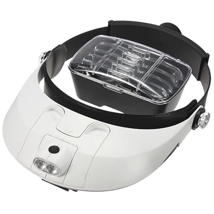 Pandelup med vipbar LED-lys og 5 stk. udskiftelige binokulære linser (1,0×/1,5×/2,0×/2,5×/3,5×). Kraftig, justerbar LED-belysning sikrer at emner, der arbejdes med altid er belyst ned til mindste detalje. LED lysenheden kan let afmonteres og anvendes som bordbelysning. Har desuden kraftigt hovedbånd med kraftig spændeskrue. Leveres med opbevaringskasse til linser.