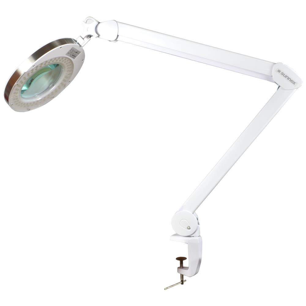 SLM-Luplampe med et forstørrelsesarmatur med 5 LED-dioptrier monteret i et cirkulært mønster omkring forstørrelsesglasset. LED-teknologi giver lang levetid, lavt energiforbrug og lav varmeeksponering af belyste genstande. Lampen er hurtig at montere – uden huller og med skruetvingebeslag. Anvendelse i laboratorier, til præcisionsarbejde, og i let industri. Input 220-240V AC 50Hz. IP20. Strømforbrug 8W. Armlængde 400×400 mm. Farvetemperatur 6.500 K. Lys-output 500 lm. Farvegengivelsesindeks CRI 80. Levetid >25.000 timer. Monteres med skruetvingebeslag: åbning 64 mm.