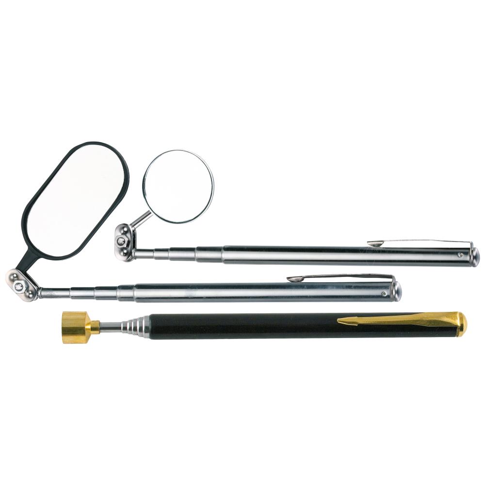 Teleskopsæt med to inspektionsspejle hhv. rundt og elipseformet, med teleskopskaft med lommeclips, samt en kraftfuld magnet til opsamling af magnetiske genstande som fx bolte og møtrikker – ligeledes med lommeclips.