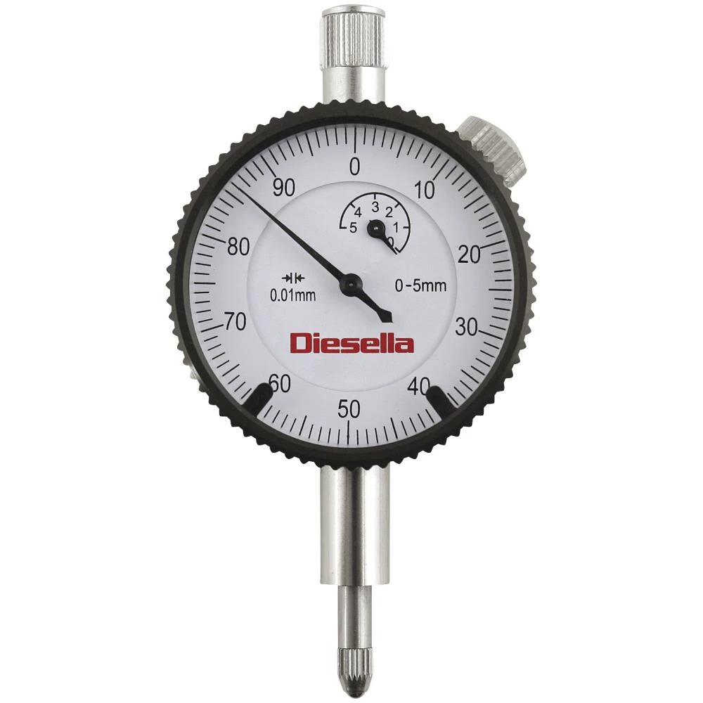 Måleur med tolerancepile og drejelig skive til nulstilling. 42 mm ur med ø8 mm skaft og skala fra 0-100. 0-5 mm måleområde og 0,01 mm aflæsning. DIN 878 standard.