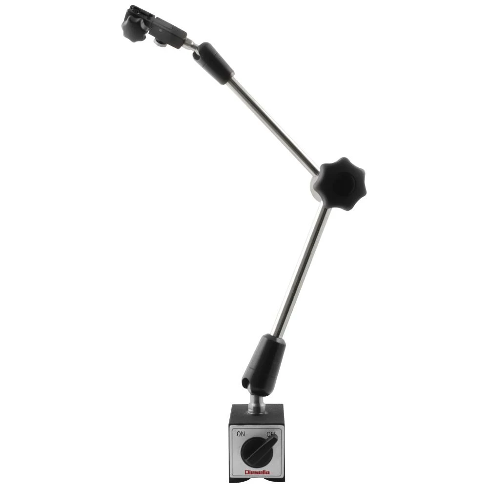 Magnetstander med prismefod, kraftig urholder, finindstilling og on/off-funktion. Mekanisk centerspænding gør at alle 3 led på holdearmen spændes på én gang. Holdekraft 100 kg/980 N. Armlængde 200+170 mm. Mulighed for ø6 mm, ø8 mm, opspænding med øje og/eller svale opspænding. Magnetfod 73×50×55 mm.