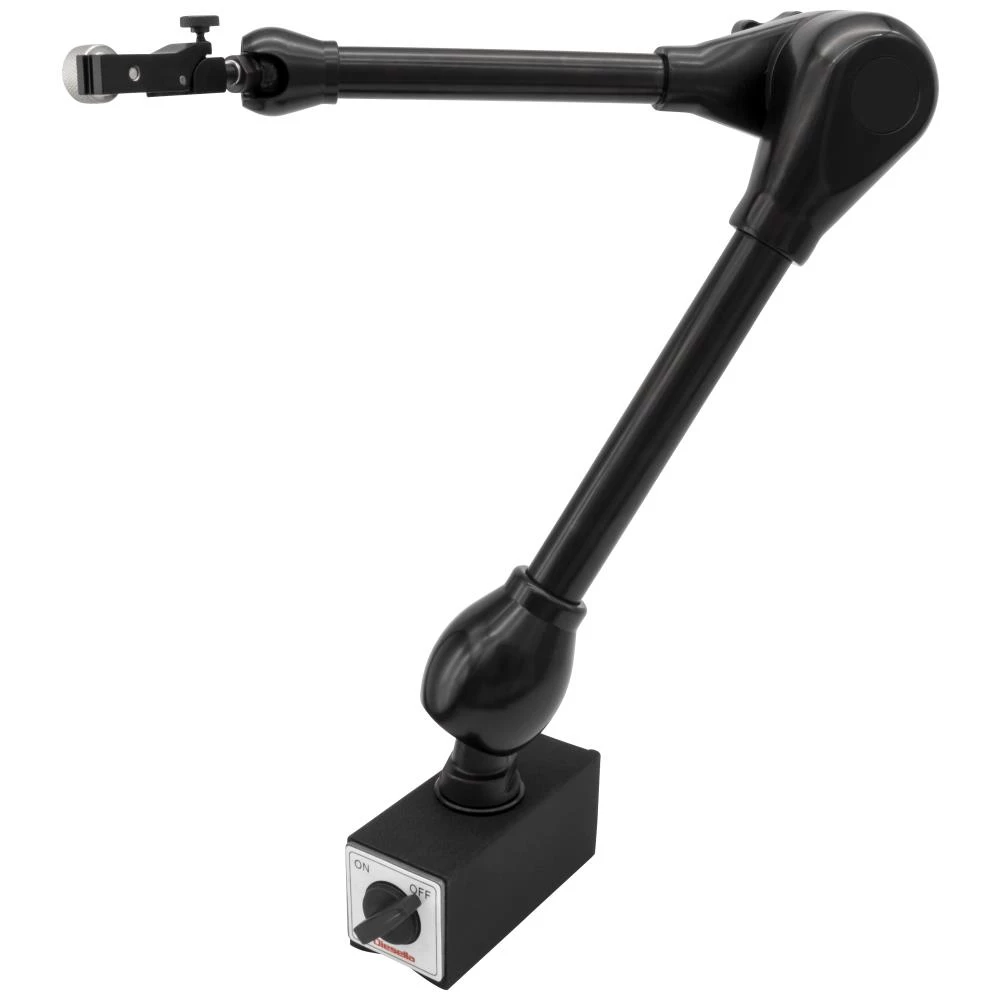 Magnetisk måleursstander med mekanisk låsning, samt en on/off-funktion så man nemt kan kontrollere holdekraften. Magnetstanderen har en prismefod og mekaniske led med mulighed for finindstilling. Holdekraft 130 kg/1.270 N. Opspænding ø8 mm. Armlængde 635 mm. Magnetfod 120×50×55 mm.