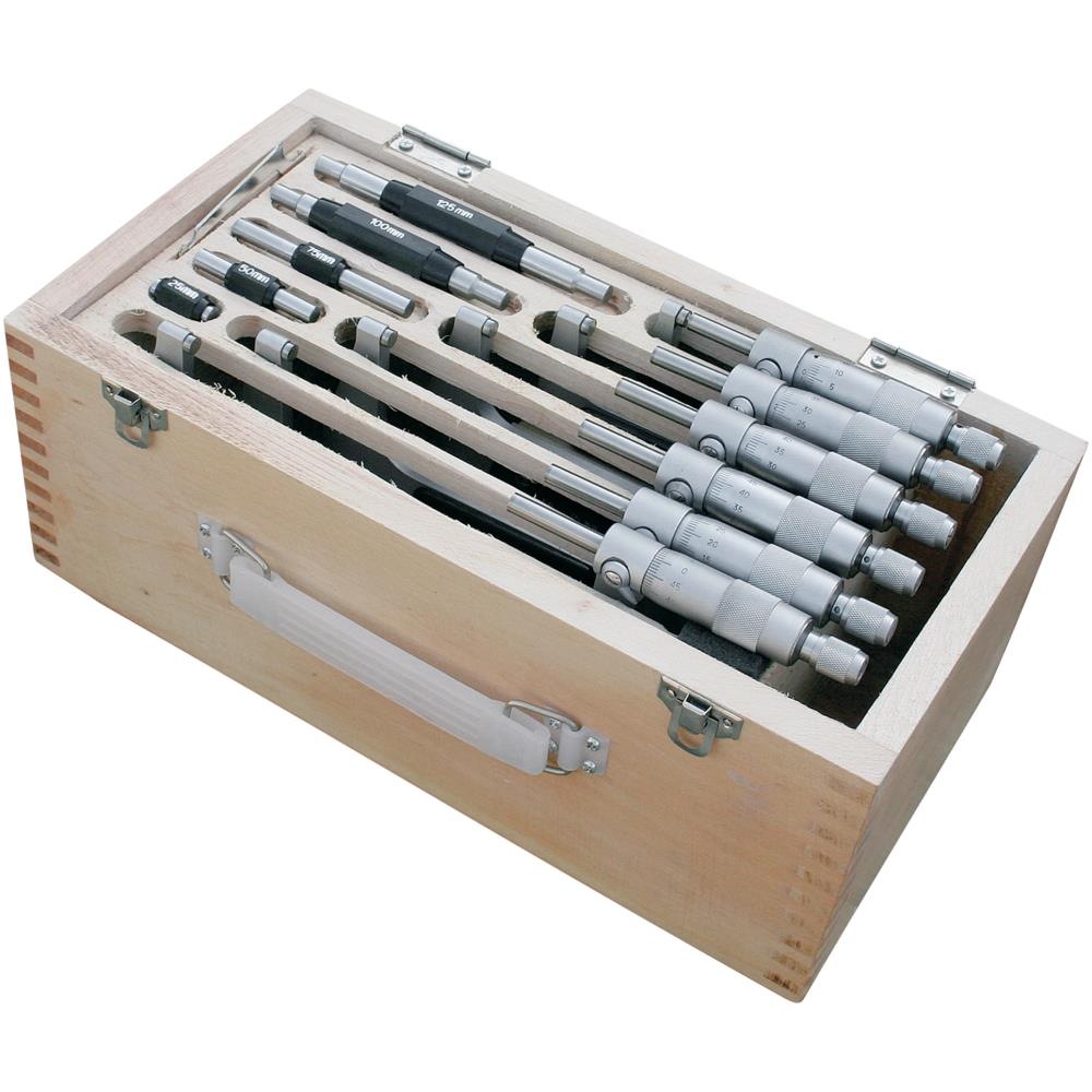 Mikrometerskruesæt med 6 dele. Mikrometerskruer med isoleret bøjle – kontrolmål medfølger fra 25 mm. I matforkromet udførsel med hårdmetal måleflader. DIN 863 standard. Leveres i træboks.