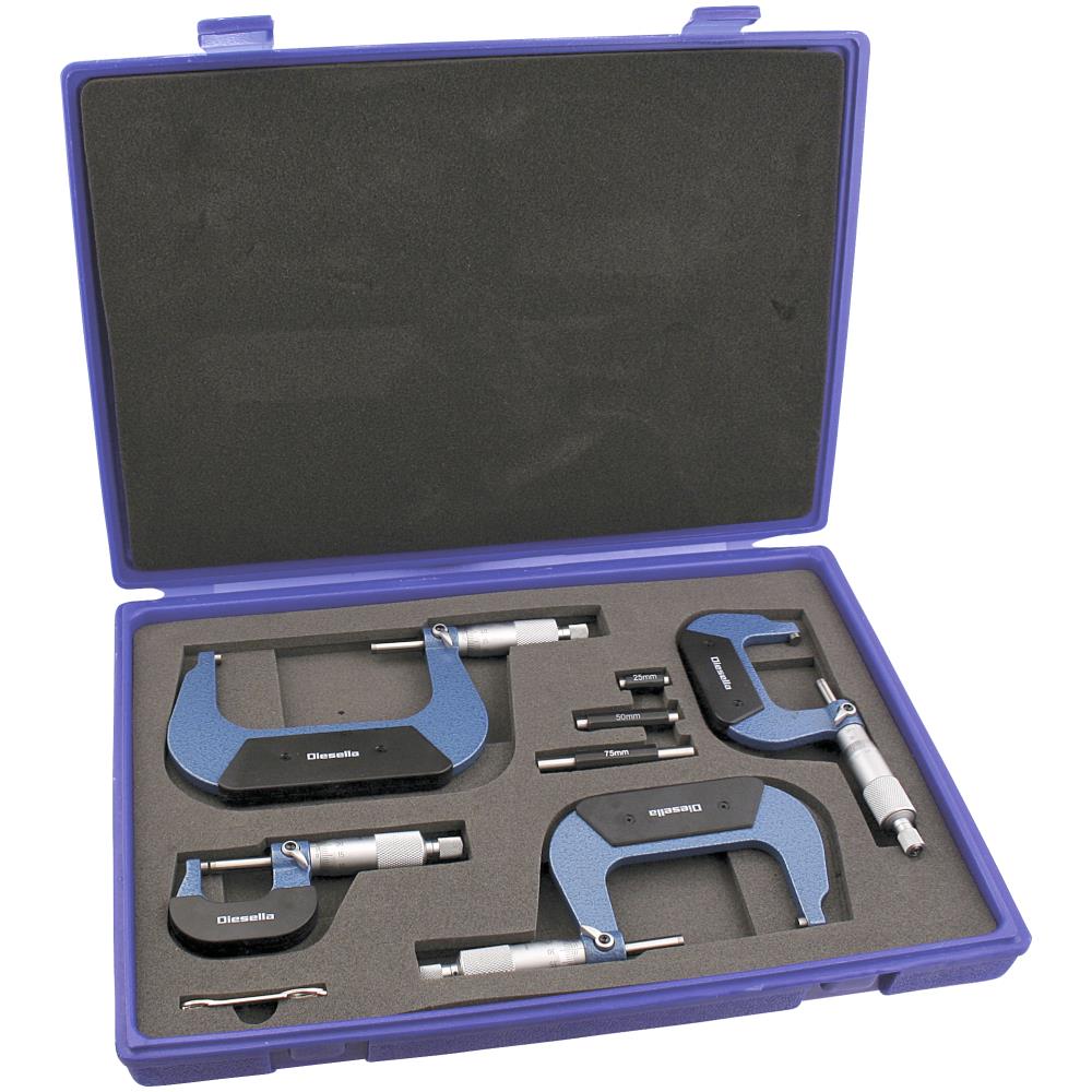 Mikrometerskruesæt med 4 dele. Mikrometerskruer med isoleret bøjle – kontrolmål medfølger fra 25 mm. I matforkromet udførsel med hårdmetal måleflader. DIN 863 standard. Leveres i opbevaringskuffert.