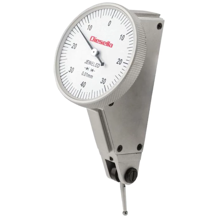Vippeindikator med hvidt skråstillet måleur (ø32 mm). Aflæsning 0,01 mm. Måleområde 0-0,8 mm. Skala 0-40-0. Vippearm 16 mm (udskiftelig). Leveres i plastkasse.