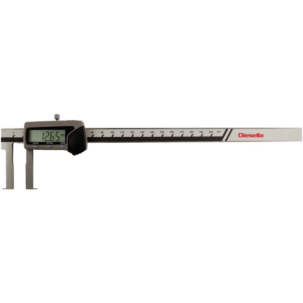 Digital-skydelære med udadvinklede målespidser. Skydelæren har manuel on/off-funktion, nulstilling og omskifter mellem millimeter og tommer. Model med 25-200 mm måleområde og 0,01 mm aflæsning. 44 mm kæbe. Udført i rustfri stål. Leveres inkl. 1×LR44 batteri.