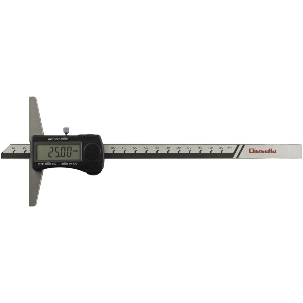 Digital-dybdemål med nulstilling og omstilling mellem millimeter og tommer. 0,01 mm aflæsning. DIN 862 standard. 1×LR44 batteri medfølger. Fås i flere varianter.