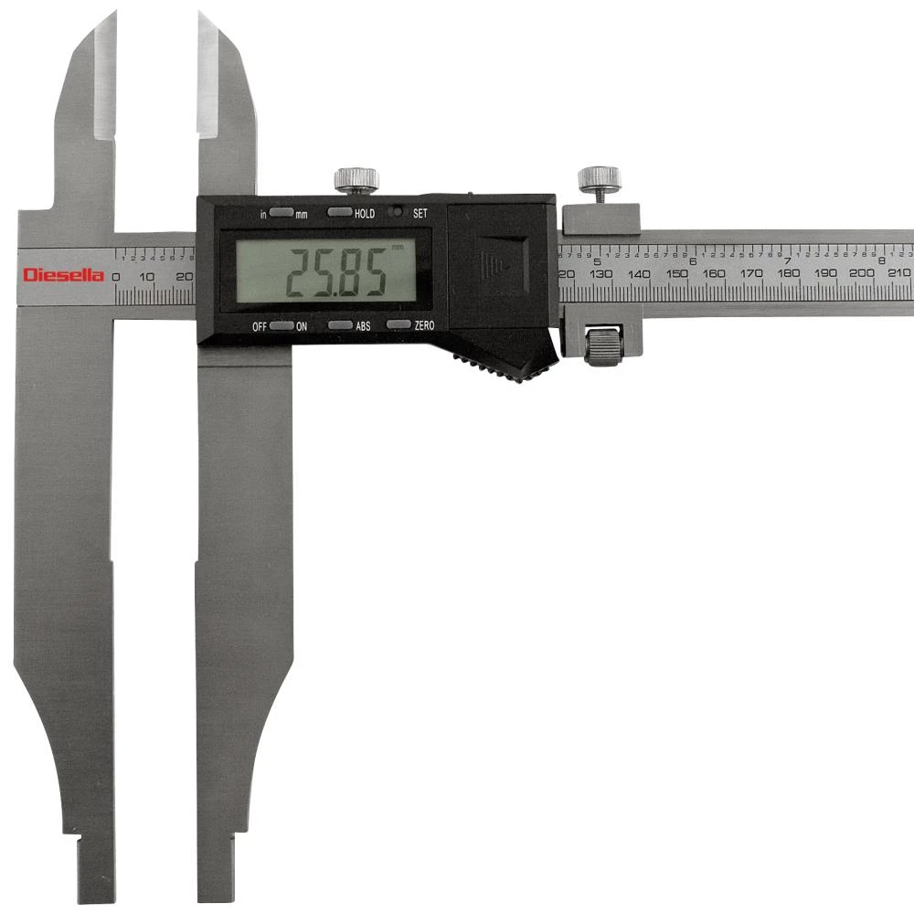 Digital-skydelære med dobbeltkæbe (hhv. 60 mm og 150 mm) og finindstilling. Måler fra 0-500 mm med 0,01 mm aflæsning. Med afrundede måleflader for indvendig måling. Dataudgang, automatisk tænd/sluk funktion efter ca. 5 min. stilstand, veksling mellem mm og tommer, samt Hold- og Set funktion. Leveres i en robust plastkasse til opbevaring inkl. 1× CR2032 batteri.