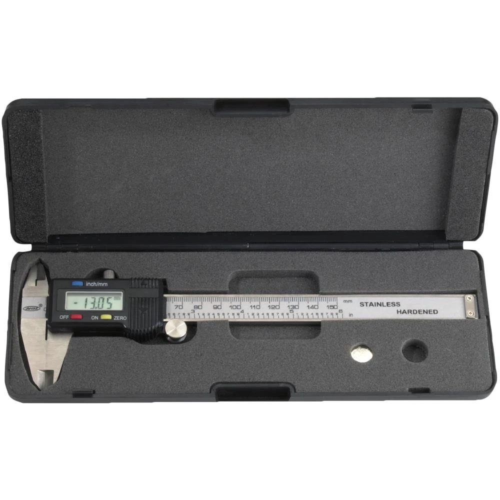 Digital skydelære af rustfast stål med både fingerrulle og låseskrue. Måleområde 0 – 150 mm / Aflæsning 0.01 mm. Leveres i beskyttende opbevaringsboks.