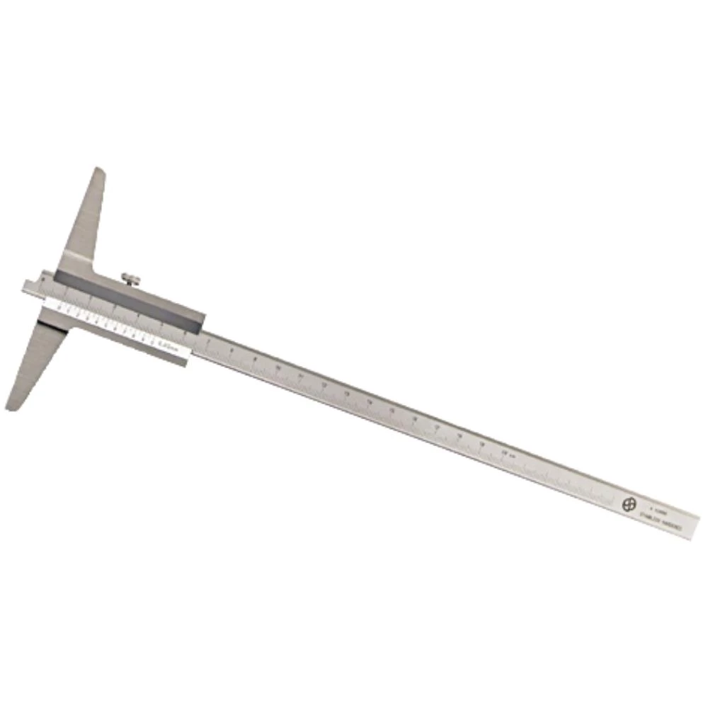 Dybdemål med 0-200 mm måleområde, 0,05 mm aflæsning. 100 mm bro. Matforkromet udførsel. DIN 862 standard.