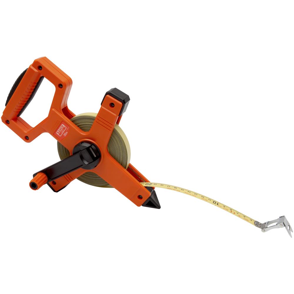 Langt båndmål med stålbånd. Metrisk skala, klasse II. Stålbånd. Åben holder for hurtig rengøring. Komfortabelt gummigreb passer perfekt i hånden, samt langt håndsving for lettere båndoprulning. Fås i flere længder.
