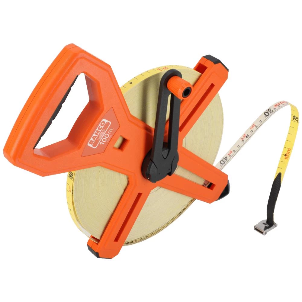 Båndmål med ramme. Klasse II. Komfortabelt gummigreb passer perfekt i hånden, samt langt håndsving for lettere båndoprulning. Glasfiberbånd med nylonbelægning og stålruller der forhindrer båndet i at sno. Fås i flere længder.