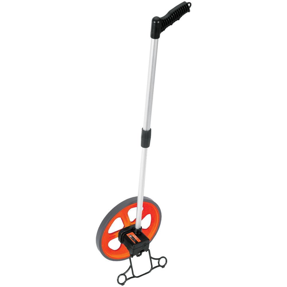 Metrisk gummibelagt målehjul med gummibelagt hjul, justérbar håndtagshøjde, praktisk støtteben der kan foldes ned, trykknap hjælper med at nulstille hjulet samt justerbart håndtag til behagelig brug. Diameter 250 mm. Enkel måling af afstande op til 9999,9 mtr.