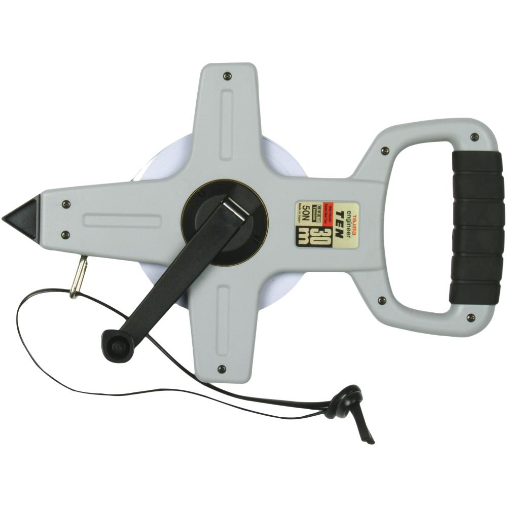Engineer Ten stålbåndmål monteret på krydsramme i slagfast ABS plast. Sammenklappelig greb til oprulning. 13 mm båndbredde. Hvid bånd med millimeter inddelt skala. Med nulpunkt i ringens yderkant. Tåler 50N træk uden deformering. Godkendt efter JIS1. Fås i flere længder.