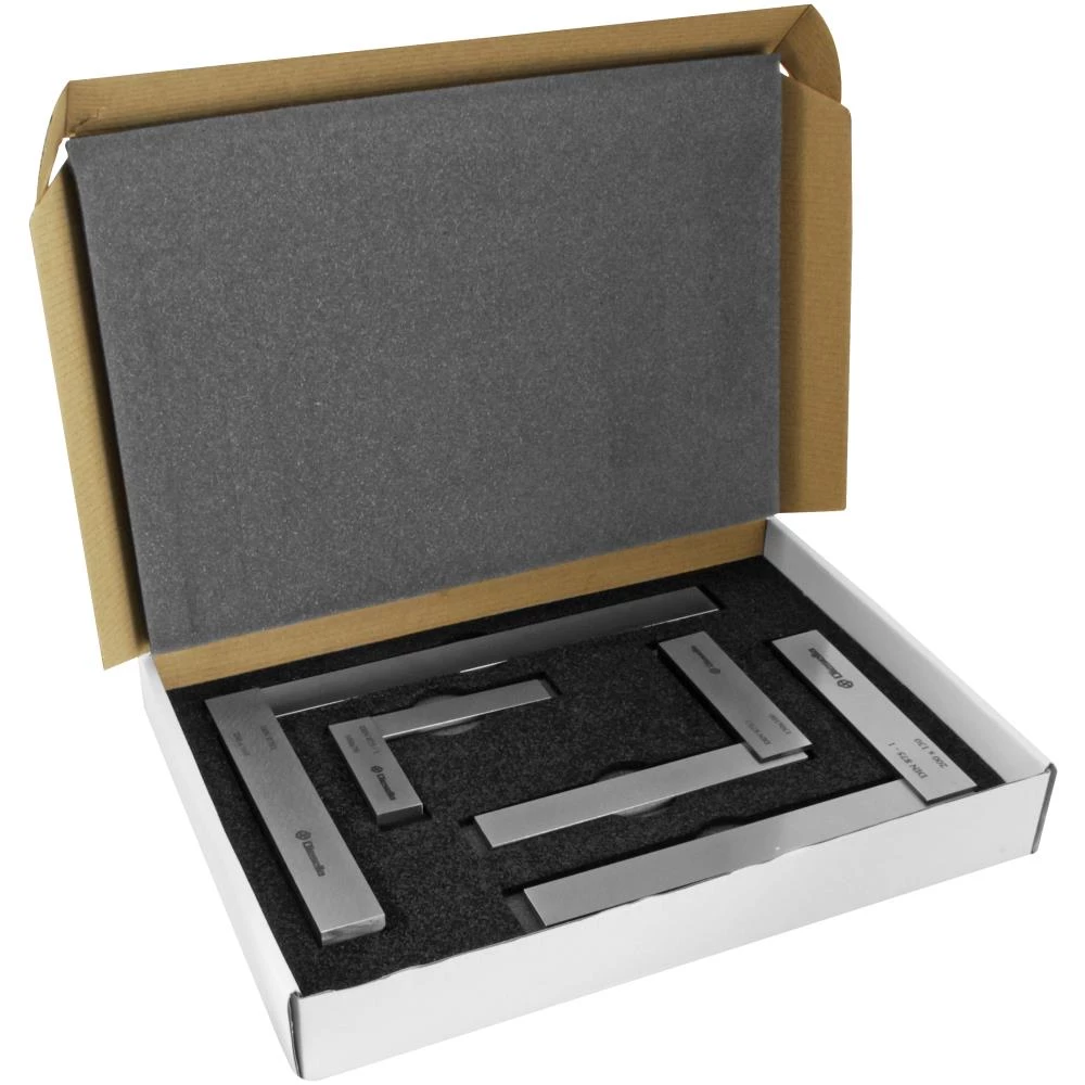 Ansatsvinkelsæt med 4 dele. Hærdede og slebne præcisions-vinkler med kraftigt anslag. Ideelle til kontrol af rette vinkler. DIN 875/1 standard. Indeholder størrelserne: 100×70 mm, 150×100 mm, 200×130 mm og 250×165 mm. Fremstillet af rustfri stål. Leveres i æske.
