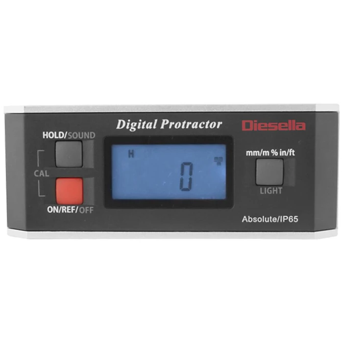 IP65 digital-vaterpas med stort, oplyst LCD-display og fod med kraftige magneter. Design med prismeudskæring på to sider til anvendelse på rør mv. Vaterpasset måler i grader 4×90°, hældning mm/mtr. og hældning i procent. 0,05° aflæsning og ± 0,15° nøjagtighed. Vender automatisk tallene for nem aflæsning. Lydindikation ved 0° og 90° samt HOLD-funktion. Bruger 2 stk. AAA batterier.