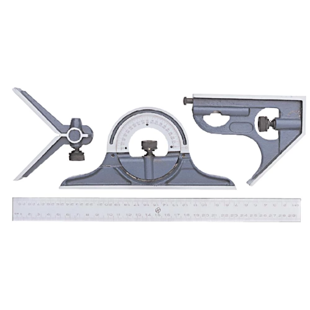 Kombinationsvinkelmåler til et hav af indstillings-, kontrol, opmærknings- og opmålingsopgaver. Indeholder: vinkelmåler 0-180° med vaterpas, matforkromet lineal 300 mm, vinkelhoved samt centreringsvinkel. Linealen kan rotere 360° om vinkelmåleren. Måleområde 0-180°.