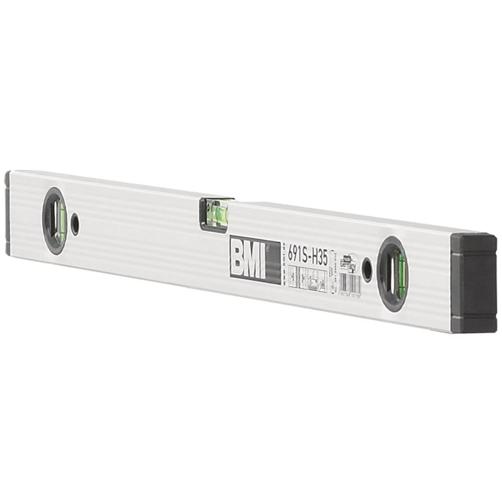BMI vaterpas H35 aluminium. Rillet og eloxeret aluminiumsprofil med 3 kraftige og stabile libeller i plexiglas. Stødabsorberende endebeslag. Nøjagtighed i normalstilling: ±0,5 mm /mtr. Nøjagtighed i omvendt pos. ±0,75 mm/mtr. Fås i flere varianter.