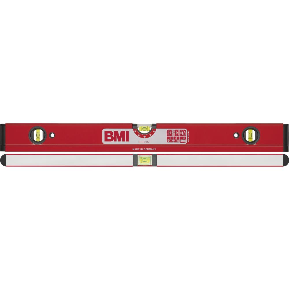 BMI vaterpas Robust. Ekstrem stærk 4-kammer aluminiumsprofil med 2 fræste måleflader, støddæmpende endekapper samt 3 kraftige og stabile libeller i plexiglas. Rund H-libelle med lupeffekt sikrer ekstra nem og “spejlfri” aflæsning. Premium kvalitet. Nøjagtighed i normalstilling: og ved “omvendt” måling 0,5 mm /mtr. Fås i flere varianter.