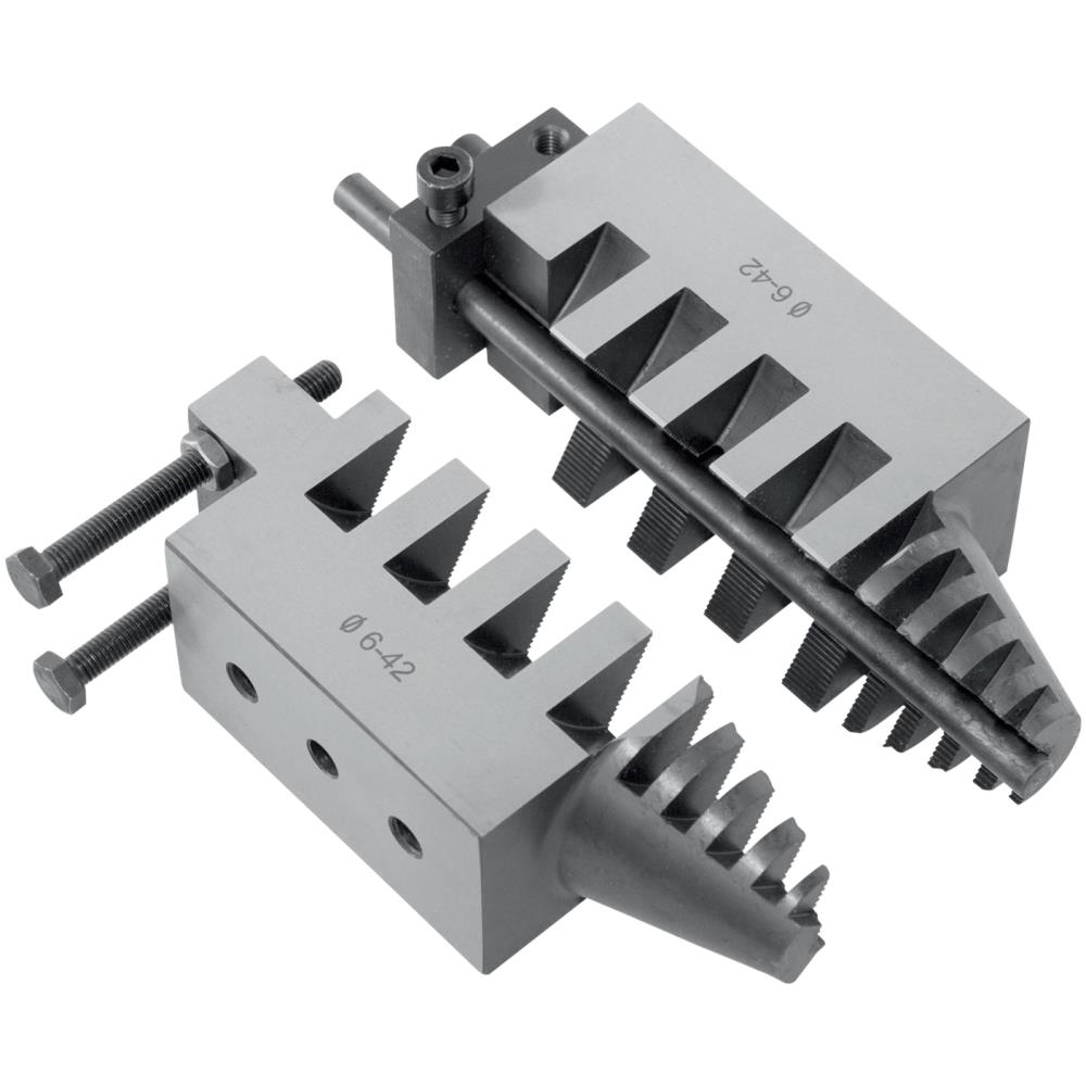 Specialspændbakker til blanktrukket materiale, stiftskruer, 6kt-skruer og nipler. Emnets længde foran spændanordningen uden gevind mindst 15 mm, Ø 6-42 mm.