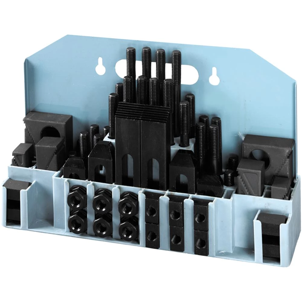Spændesæt med 58 dele. Alle spændestykker er hærdede, trappeklodser er fremstillet i sintret stål og alle dele er sort oxideret. Indeholder: 24 pinbolte, 4 stk. af hver 75-100-125-150-175-200 mm, 6 T-not møtrikker, 6 bundmøtrikker, 4 forlængermøtrikker, 12 spændeunderlag (6 par), 6 spændejern (3 par): 100-150-200 mm. Leveres i praktisk PVC-/stålkasse. Fås i flere varianter.