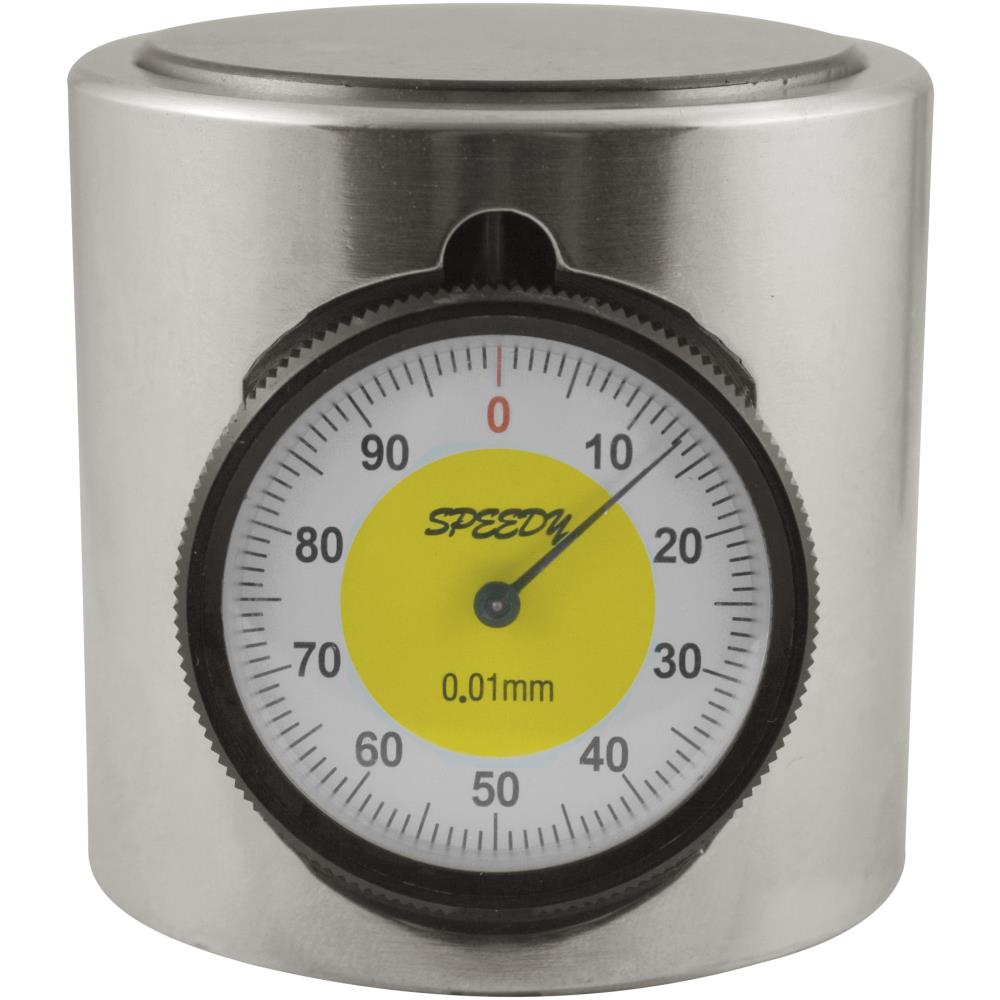 Toolsetter med magnet og måleur. ø42 mm tasteflade og 50 mm højde ±0,005 mm. Kan bruges horisontalt og vertikalt. Slebet på alle flader.