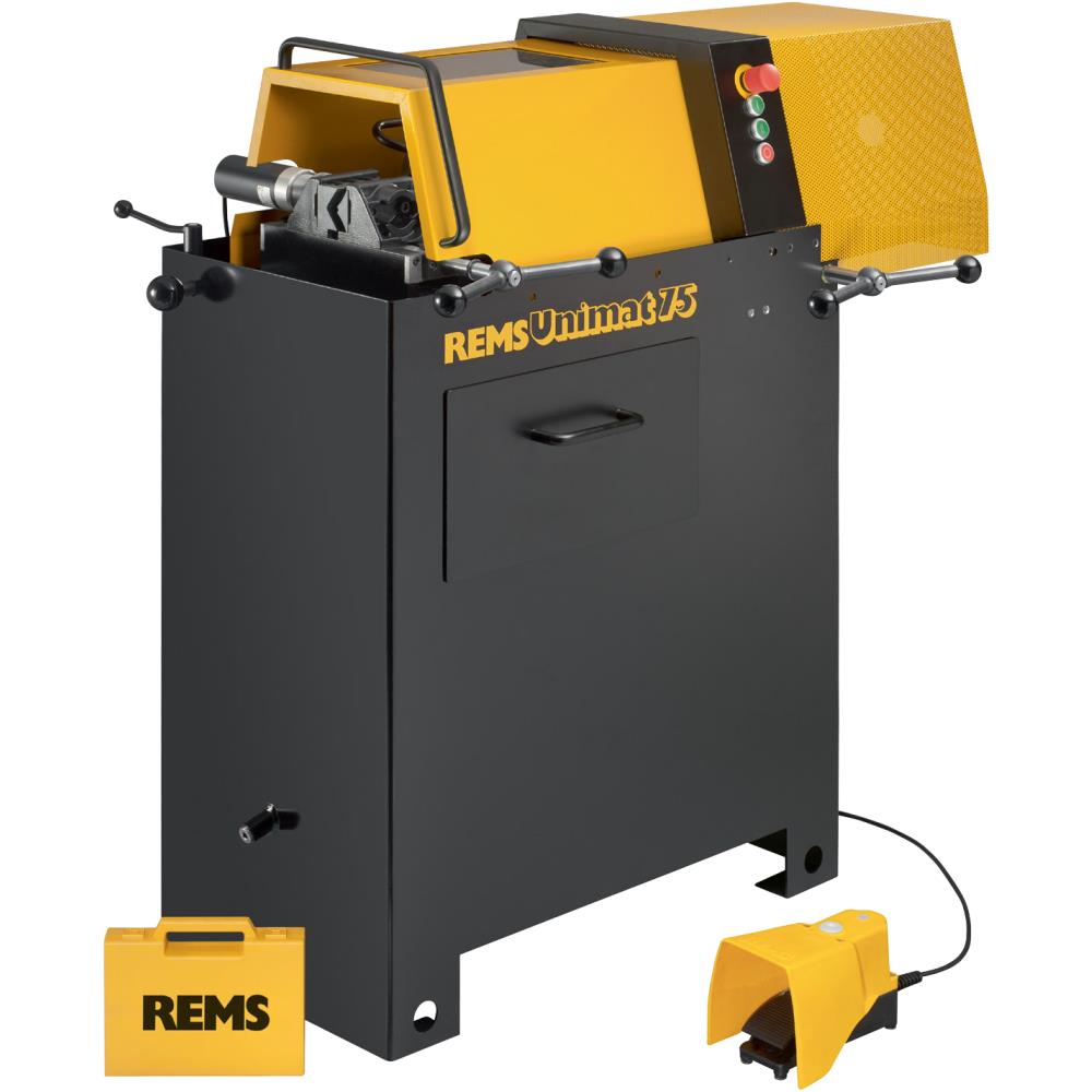 Rems Unimat 75. Tangential Strehler skærebakke system. Stort skæreområde. Hurtigtarbejdende, kort omstillingstid. Til stk- eller serieproduktion. Nem at betjene. Aflaster dyre drejebænke og dyr arbejdskraft. Faststående materiale-drejende skærehoved. Kompakt, robust konstruktion til kontinuerlig brug. Gevindskærehoved med tangential Strehler skærebakker i et selvcentrerende holdersystem. Skærebakkerne kan efterslibes. Efter let påbegyndelse af skæringen med tilspændingshåndtaget og tandstangen føres skærehovedet automatisk frem (intet startgevind nødvendigt). Svejset maskinfundament med stort oliekar og stor, udtagelig spånbakke. Uopslideligt planetgear med hult solhjul for op til Ø 30 mm lange gevind. Gennemprøvet specielt til gevindskæring med stærk polomskiftbar trefasemotor med hulaksel, 2000/2300 W optaget, overbelastningssikring. Kontakt til ændring af drejeretningen for venstre- og højregevind. 2 skærehoveder omdrejningstal 70 og 35 min-1. Stabil, vridfri, selvcentrerende universal spændanordning til hele spændområdet med specialfortandede og hærdede spændbakker. Spændes enten manuelt eller oliehydraulisk-pneumatisk ved at trykke på fodpedal (driftstryk 6 bar).